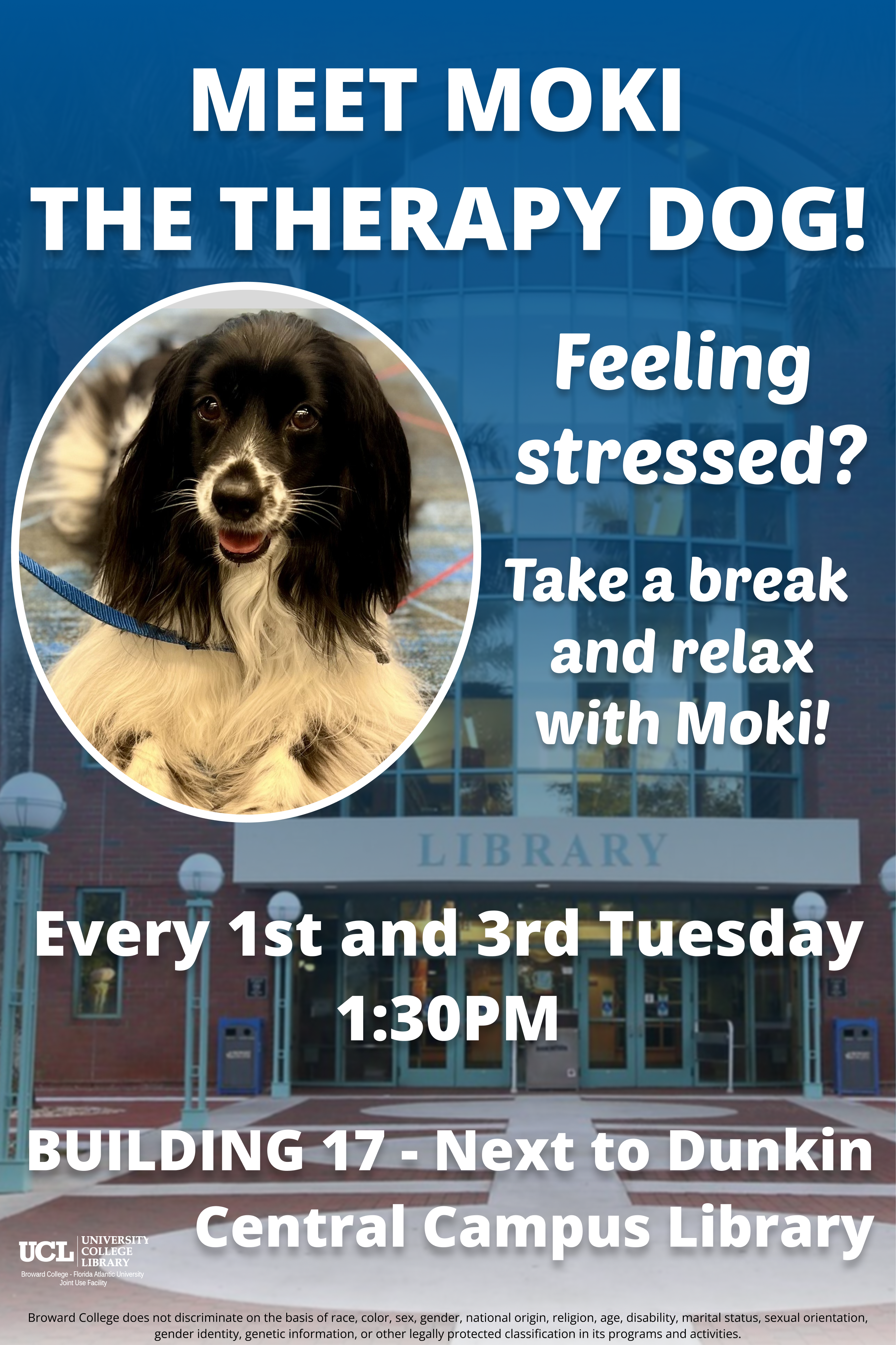 Moki, the therapy dog, is available at the Central Library on the first and third Tuesday of each month.